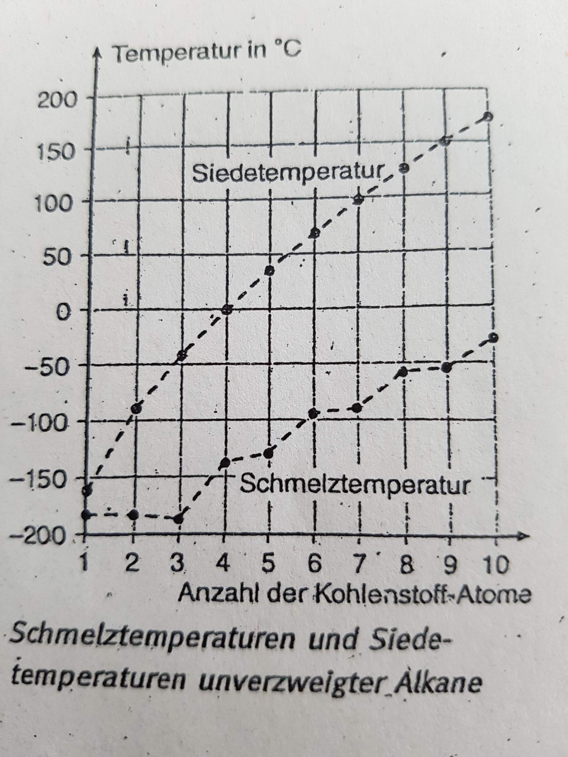 Tabelle mit den Messwerten. Die Schmelz- und Siedepunkte steigen mit der Anzahl der Kohlenstoffe. Kohlenstoff ist ein Nichtmetall das u.