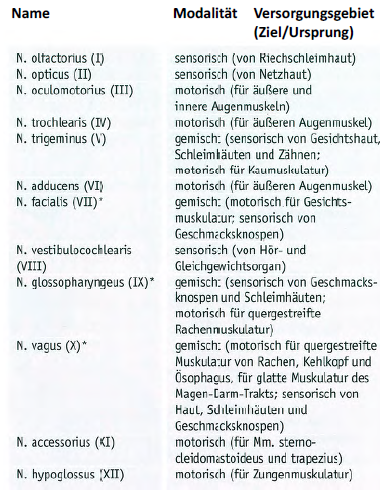 Die Nerven I II und VIII sind sensorische Hirnnerven. Tabelle 1 listet die Hirnnerven ihre sensorische und motorische Funktion sowie ihren Ursprungsort. Die Hirnnerven sind zwölf Nerven die direkt im Gehirn aus den Hirnnervenkernen Nervenzellansammlungen entspringen und den Kopf den Hals und Organe im Rumpf versorgen.